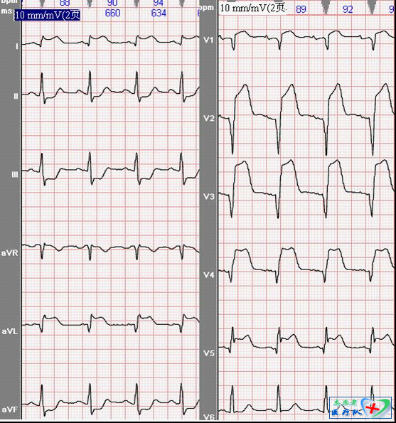 上图上宽大畸形QRS前无P波,故诊断短阵室速,若有P波(或与前的T波融合令其增高),应考虑房速伴室内差传。