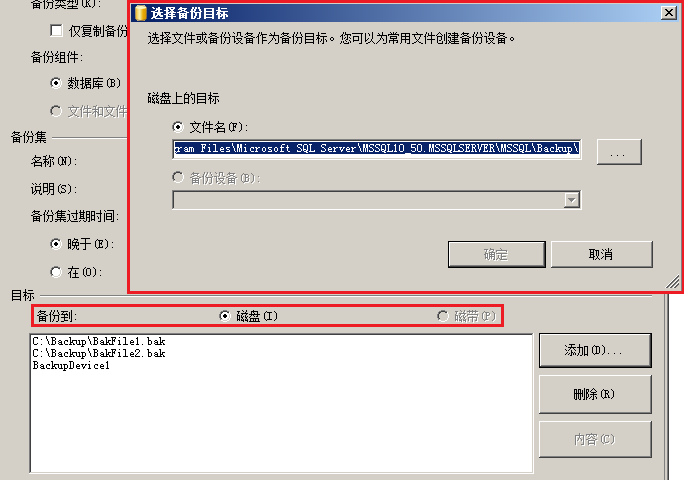 磁盘备份设备是指包含一个或多个备份文件的硬盘或其他磁盘存储介质。备份文件是常规操作系统文件。指定备份文件时,应输入其完整路径和文件名。如果您在备份到文件时仅指定文件名或相对路径,则备份文件将存储到默认备份目录中。