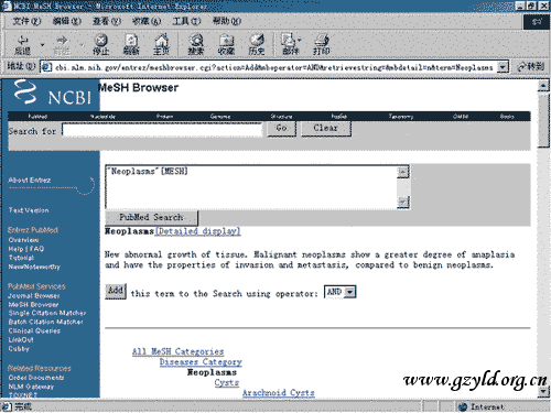 举例说明,如果你想要检索Neoplasms和bone的相关文献,首先在MeSH Browser的检索框内输入检索词Neoplasms,然后点击Browse按钮,系统显示其定义及在树状等级结构中的位置,如下图。