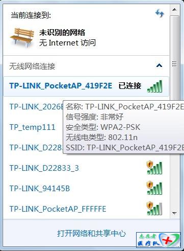 步骤6:重启完成,此时TL-WR700N的无线网络已经设置了无线安全,电脑的无线网络连接会自动断开,需要重新连接TL-WR700N的无线网络(本例中SSID为TP-LINK_PocketAP_419F2E),连接过程中需要输入TL-WR700N的无线PSK密码(本例为abcdefgh),连接上之后,如下图所示。