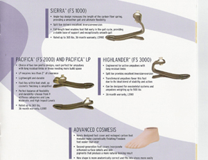 特别是假脚使用碳纤材料后,残疾人的足跟与地面接触时,冲撞产生的能量首先被碳纤材料所吸收,然后随着步伐的行进象压缩的弹簧一样,将储存的能量释放出来,从而让残疾人的行走步态更加美观,行走能力更强,走更远的路。如果脚板再根据不同人的体重、活动量、运动方式等制作成具有“适配系统工程”的功能件,那么残疾人的行走步态,行走能力将会获得最合理、最大的发挥。