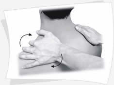 一、 放松肩部(即斜方肌) 1.掌揉肩部(轻)(图1) 揉法: 用手掌或手指的指腹在治疗部位或穴位上,通过腕关节的转动带动手掌或手指,做轻柔和缓的环旋运动。用手掌的称为掌揉法。 要领: 施者的掌、指皮肤与受者局部的皮肤相对位置不变,用力轻柔,有节律,速度均匀,由轻到重,由重到轻。运动以顺时针为主。 |