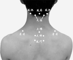 三、点按颈部穴位及痛点 6.按法: (图5、图6) 用手指、手掌或肘部按压身体某一部位或穴位处的手法。可以持续按压,也可以间断性按压(一按一松),分为指按法、掌按法、肘按法。指按法适用于按压穴位和痛点,掌按法适用于腹部、背部和四肢,肘按法适用于腰背部和臀部。 要领: 垂直按压,固定不移位,由轻到重,再由重到轻,用力持续。 颈部点按顺序:风府(正中)――双侧天柱――双侧风池――双侧肩井 颈部常用穴位: (图7) 风池:枕骨直下,胸锁乳突肌与斜方肌上端之间的凹陷处。 风府:后发际正中上1寸,枕骨粗隆直下凹陷处。 天柱:后发际正中直上0.5寸,旁开1.3寸。 肩井:大椎穴与肩峰端连线的中点。 大椎:后正中线上,第七颈椎棘突下。 大杼:第一胸椎棘突下,旁开1.5寸。 风门:第二胸椎棘突下,旁开1.5寸。 |