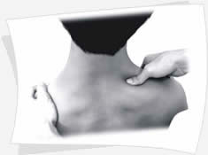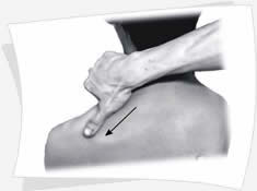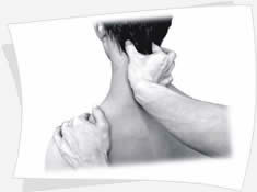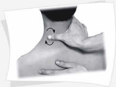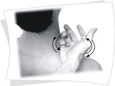 二、颈肩推揉 指揉颈部 (图3) 4.指揉法: 手法同第一步揉法,用指腹揉称为指揉法。用力点为拇指指腹,也可以用三指指揉。分别按摩颈椎两旁及胸锁乳突肌,左右交替,左右同法。 |